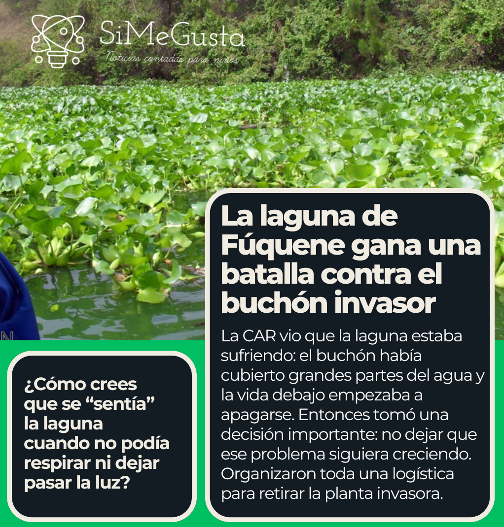 En la laguna de Fúquene estaba ocurriendo algo grave: una planta llamada buchón la estaba tapando como una cobija gigante, dejando sin luz y sin oxígeno a los seres que viven debajo del agua. Pero un grupo de expertos decidió actuar, retiraron el buchón y lo transformaron en abono para la tierra.