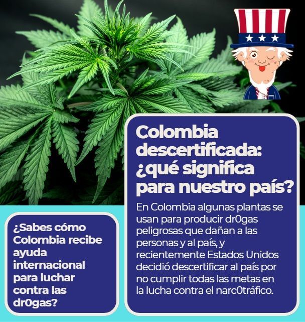 En Colombia, se cultivan algunas plantas se usan para producir drogas que dañan la salud de las personas y jóvenes de todo el mundo. 😮 A pesar de que el país trabaja para reducir los cultivos de drogas y proteger a las comunidades, parece que el esfuerzo no ha sido suficiente, y por eso Estados Unidos decidió descertificar a Colombia. Esto significa que podríamos recibir menos ayuda internacional, lo que afectaría la economía, la seguridad y los programas que protegen a los ciudadanos.