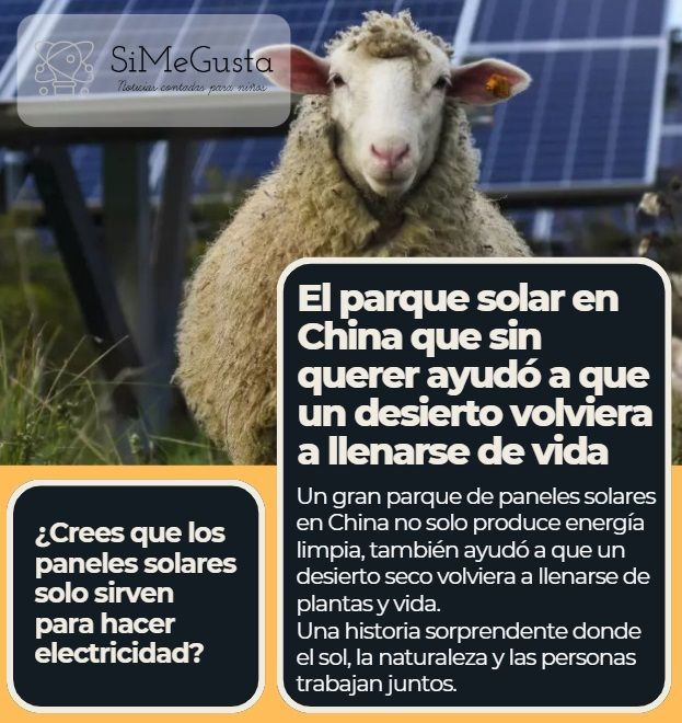 En China, un gran parque de paneles solares mostró que la energía limpia puede hacer mucho más que producir electricidad. Al instalar los paneles en un desierto, el viento se volvió más suave, el suelo conservó más agua y las plantas comenzaron a crecer otra vez. Sin buscarlo, las personas ayudaron a que un lugar seco empezara a llenarse de vida. El desierto cambió gracias al sol.