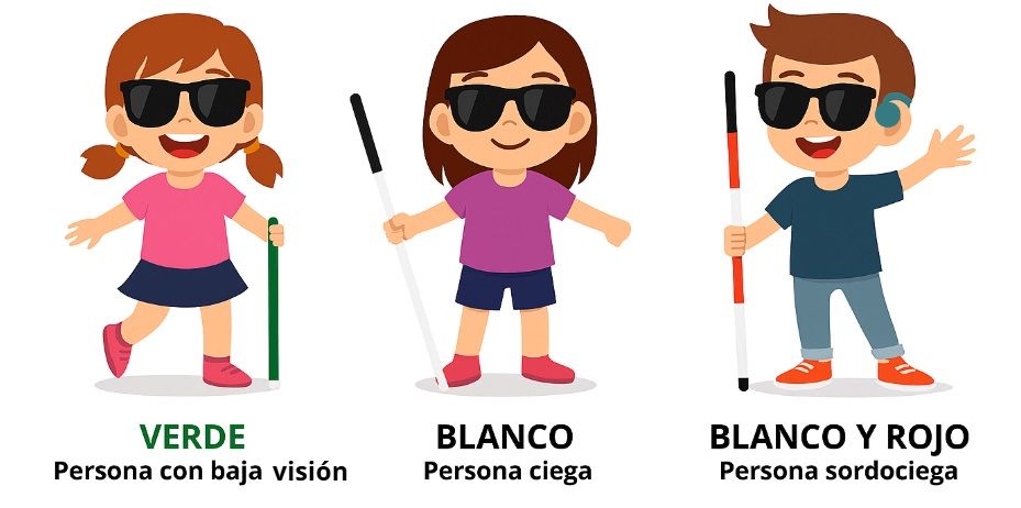 Hablemos de algo interesante: las personas con discapacidad visual usan tres tipos de bastones. Está el bastón blanco, que es el más común y les ayuda a detectar obstáculos en su camino. Luego está el bastón verde, que lo usan personas con baja visión, o sea que pueden ver un poco pero necesitan apoyo. Y por último, el bastón con bandas rojas, que indica que la persona además tiene una discapacidad auditiva.