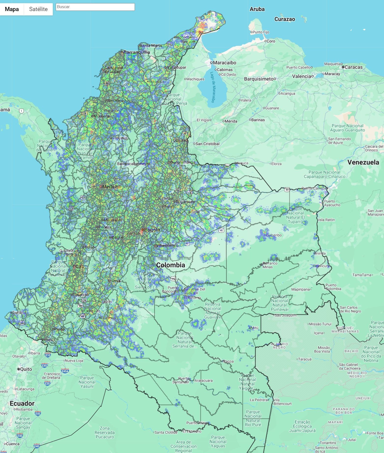 Cuando miramos este mapa de Colombia, no estamos viendo ríos ni montañas, sino la cobertura de internet en el país. Los punticos y colores muestran dónde hay señal de internet móvil y qué tan fuerte es esa señal. Entre más colores aparecen, más fácil es conectarse.