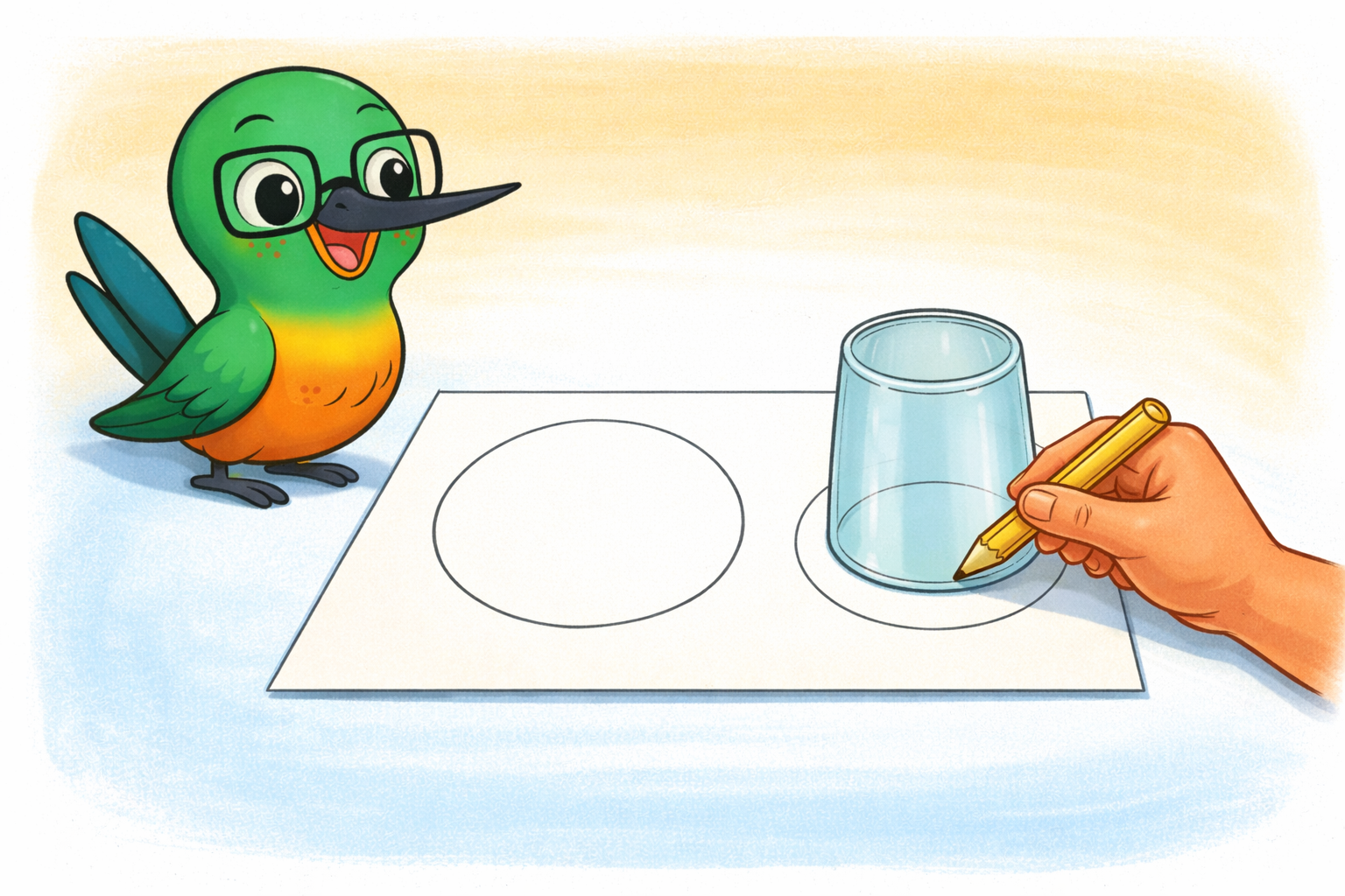 Dibuja en un círculo a Colibrí Perlita y en el otro una jaula.